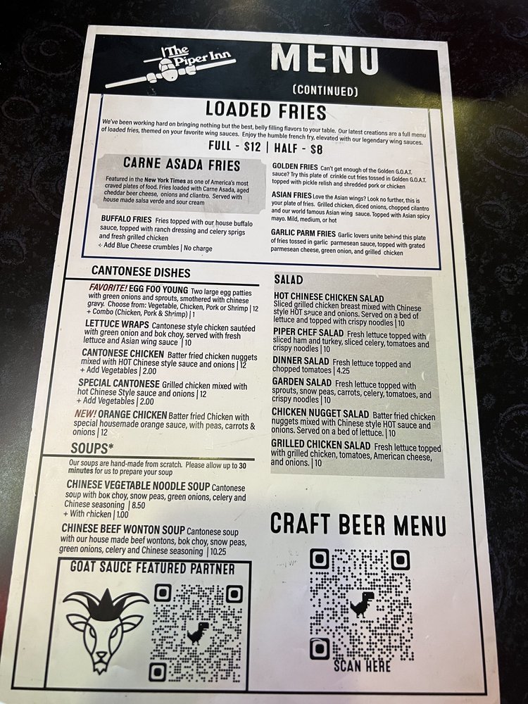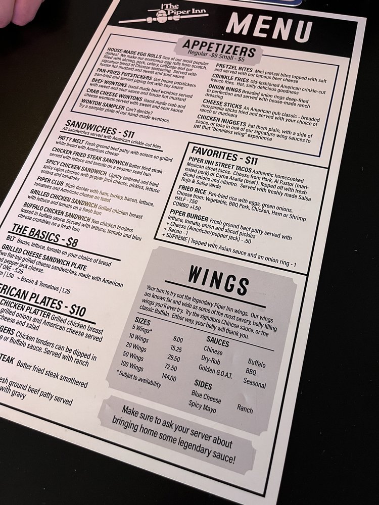 Introducing the menu at Piper Inn, a dive bar in Denver, CO, that offers a blend of Cantonese and American cuisine. Known for its flavorful chicken wings and diverse menu options, Piper Inn is a popular spot for lunch, dinner, and late-night bites. From beef wonton soup to Chinese chicken noodle soup, the soups are a comforting choice. The salads range from classic garden salads to unique options like the chicken nugget salad with Chinese style hot sauce. Customers rave about the friendly service and delicious food, particularly highlighting the pimento cheese burger with bacon and the combo fried rice. With a casual and laid-back atmosphere, Piper Inn is the perfect place to grab a meal, watch a game, or simply unwind with a drink.